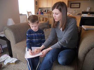 Me helping Trey write his letters. We started using the book, "Teach your child to read in 100 easy lessons." I love the book and highly recommend it.